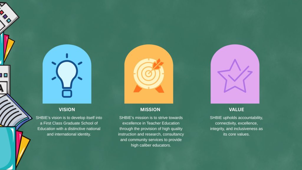 As a graduate school, SHBIE offers graduate programmes featuring high quality instruction and an academic curriculum designed to raise teaching standards and support effective school systems. The Institute’s main purpose is the preparation of primary, secondary and technical school teachers and educational administrators. In addition, it provides introductory courses related to more specialized educational roles such as guidance and counselling, remedial teaching and curriculum design.